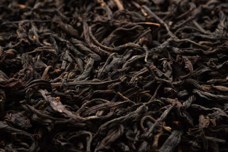 Close-up of black dry tea leaves wallpaper background, texture full frame banner or poster dried tea. Dark abstract food and drink backdrop. Advertising concept. High quality photo. Copy ad text space