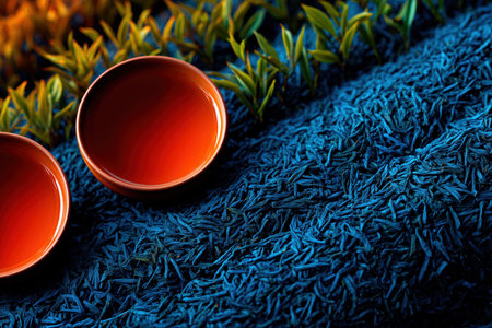 Two tea cups sit on a vibrant textile background, surrounded by lush greenery. The warm colors of the tea contrast beautifully with the cool tones of the fabric, creating a visually appealing composition. ai generated.