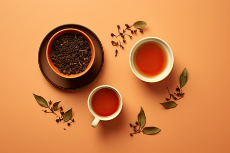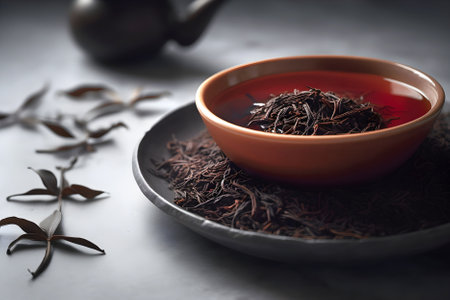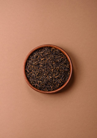 Dry black tea in ceramic bowl on dark background with copy space. AI generated.
