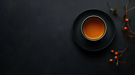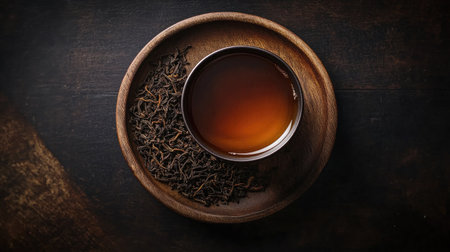 A top-down view of a hot tea cup with dried tea leaves on a wooden plate, all placed on a wooden table with a deep black background, highlighting the rich, earthy tones