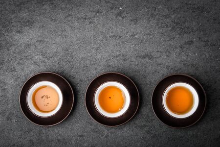 Hot tea cup on the black wooden table, flesh morning drinking, bird eye view shot