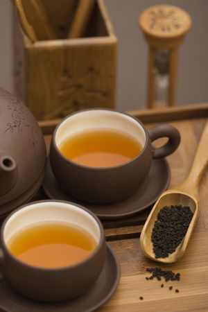 A serene tea ceremony scene featuring rustic wooden elements and elegant cups. The combination evokes a sense of calm, tradition, and beauty in simplicity.