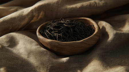 Small wooden bowl filled with dry black tea leaves on a linen cloth, capturing the earthy tones and delicate textures in natural light.