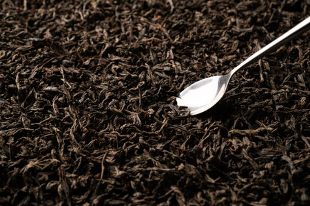 A teaspoon scooping up black loose-leaf tea and being examined in detail. Close up, angled view