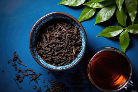 Flat lay of dried pu-erh tea leaves on a blue background, part of a tea ceremony.