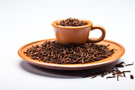 Cup of freshly brewed black tea and dry black tea on white background with copy space. AI generated.