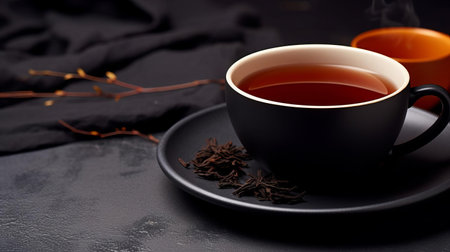 Cup of freshly brewed black tea, teapot and dry black tea on dark background with copy space. AI generated.