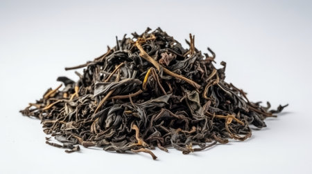 Artistic arrangement of black tea leaves with delicate white flower petals, showcasing natural textures and colors. Perfect for beverage inspiration and culinary presentations.