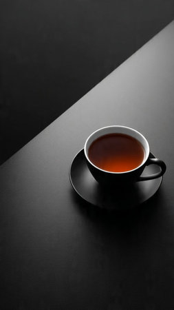 a steaming cup of black tea sits elegantly on a minimalist table setting, capturing the essence of simplicity and sophistication, with the varied angle of the shot adding a touch of creativity to this serene still life photography, evoking feelings of calmness and relaxation. ai generated