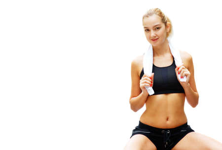 Workout woman against white, from a series of photos.