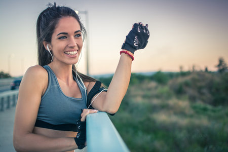 Fitness woman in sportswear listening music with earphones after training outdoors at beautiful sunny day.