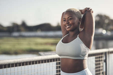Curvy Afro woman doing workout exercises session - Young African female having fun training outdoor - Sporty people lifestyle concept