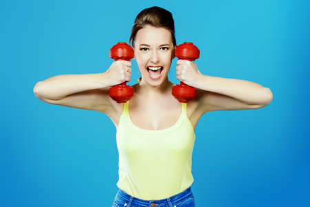 Athletic woman doing physical exercise using dumbbell over blue background. Sport and healthcare concept