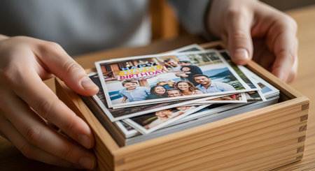 A pair of hands holds a stack of printed family photographs, preparing to store them inside a wooden keepsake box. The top photo displays a happy family celebrating a birthday outdoors, capturing a cherished memory. This scene represents memory preservation, organization, and the sentimental value of physical prints.