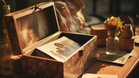 A beautiful vintage image of an old box filled with fading photography. The delicate paper photos scattered across a wooden table evoke a sense of family love and nostalgia.