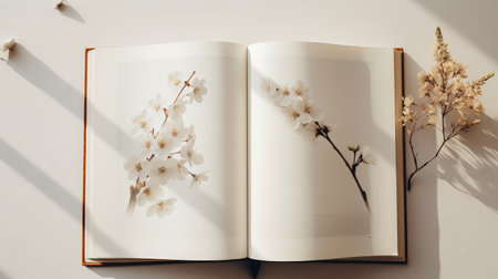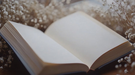 An open book on a wooden surface invites creativity, framed by soft light and delicate flowers, evoking tranquility.