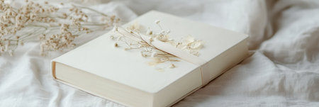A cream-colored journal with a ribbon and pressed flowers rests on soft fabric, bathed in warm light, inspiring calm and creativity.