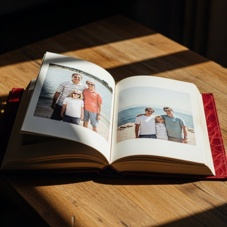 A beautifully crafted photo album lies open on a clean white surface, showcasing a stunning coastal landscape from a past adventure.