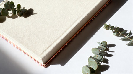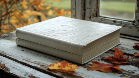 A white leather bound photo album rests on rustic wooden table, surrounded by autumn leaves, evoking sense of nostalgia and warmth..