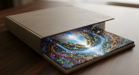 A book is slightly opened from its hardcover case, revealing a glowing, magical fantasy world on its pages. The illustration shows a waterfall, enchanted forest, and sparkling lights, with small fairies flying out. This image symbolizes imagination, fantasy, storytelling, and magic.