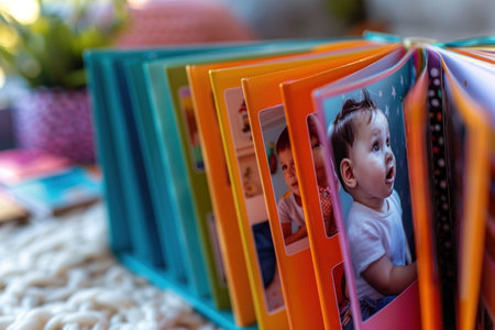 Decorative baby photo album with inspirational quote on a wooden table. That the image is generated using AI.