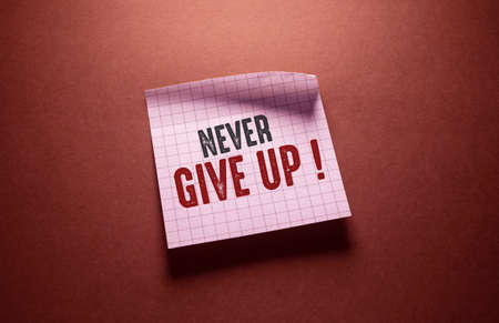 never give up word on stick note on table ,