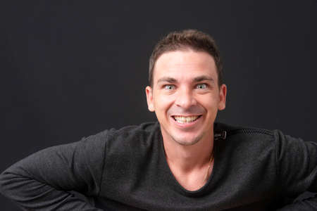 Close up portrait of young smiling handsome guy in black t-shirt isolated on black