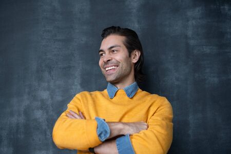 Closeup studio portrait of happy mulatto man against a grey background looking at the camera. - Image