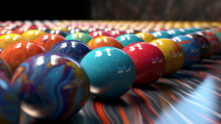 This captivating image showcases a lineup of colorful textured balls on a vibrant surface, creating an engaging visual composition with soft lighting and shadows.