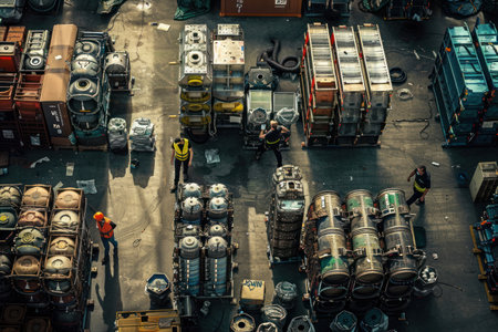 An engaging photograph of aircraft engines stacked for shipment, with workers organizing and preparing them, capturing the hustle and bustle of the wholesaling environment. --ar 3:2 --v 6 Job ID: 4486ea64-5b76-4ef3-a591-0b3968b9abcf