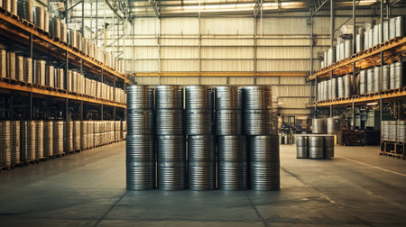An industrial warehouse with metal barrels neatly arranged on shelves, focusing on storage and logistics. The image highlights the organized environment and large-scale operations in the warehouse.