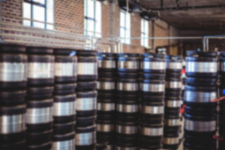 Panoramic view blurry background stack of barrels in cellar at American brewery