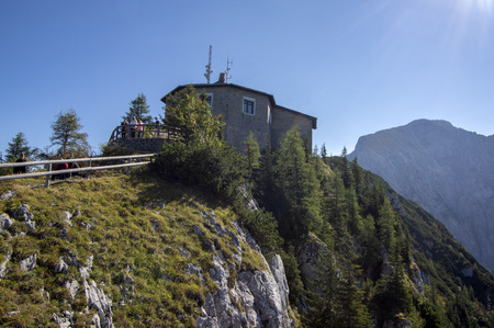 Berchtesgaden, Germany - September 28, 2016: View of the Kehlsteinhaus, also known as Hitler's Eagle Nest, a Third Reich-era cabin on top of the summit of the Kehlstein, near Berchtesgaden, Germany.