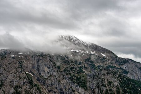 Grey clouds over a steep barren rocky mountain peak in Berchtesgaden, Bavaria, Germany