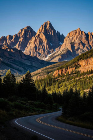 The image captures a stunning sunset over an open highway that runs through rolling mountains, with golden light casting shadows and highlights across the landscape, evoking a sense of freedom and adventure on the open road.