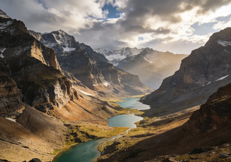 Alpine lake in the Swiss Alps with snow-capped peaks