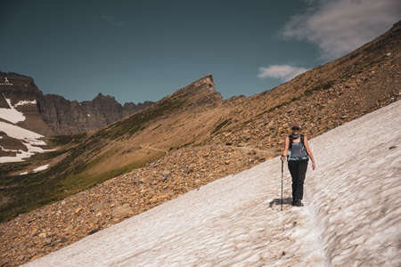 Woman treks across snowfield covering trail to Piegan Pass in Glacier National Park