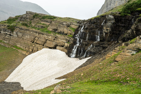 Snowmelt Drops Over Cliff Wall and Under Snow Field along the Piegan Pass Trail in Glacier National Park