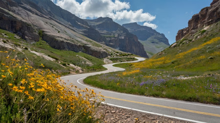 A winding asphalt road cuts through a mountainous landscape, flanked by green grass and wildflowers under a blue sky with clouds. The scene captures a scenic route through rocky terrain.