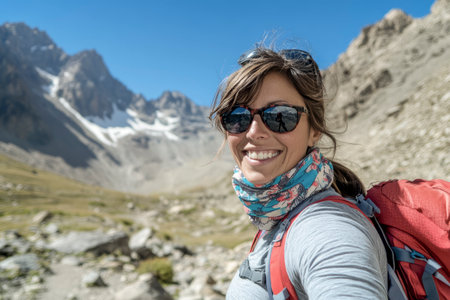 Smiling woman hiking in the mountains with snow-capped peaks and a bright blue sky in the background