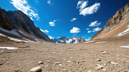 Discover a stunning mountain landscape featuring a clear stream flowing through lush greenery. The majestic peaks rise against a blue sky, creating a serene and peaceful outdoor scene.