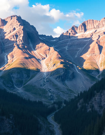 Discover a stunning view of a winding road cutting through majestic mountains, framed by blue skies and fluffy clouds, perfect for outdoor adventures.