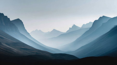 This stunning mountain landscape captures a tranquil scene with gentle mist enveloping the peaks, creating an atmosphere of serene beauty and peaceful exploration.