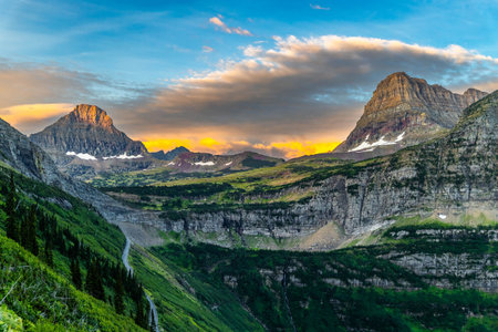 A scenic sunrise captures mountain peaks and colorful clouds along the Highline Trail in Glacier National Park