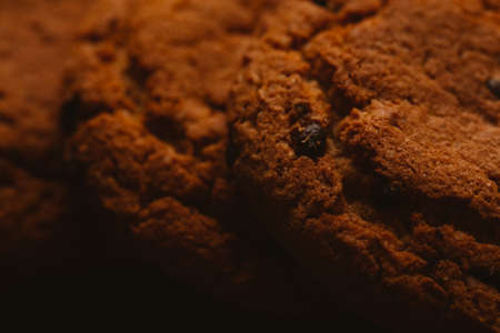 Chocolate chips cookies, close up, macro selective focus