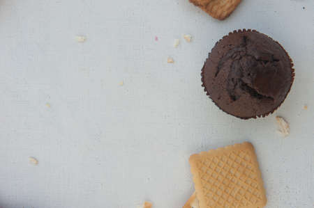 muffins with chocolate on blue and yellow background