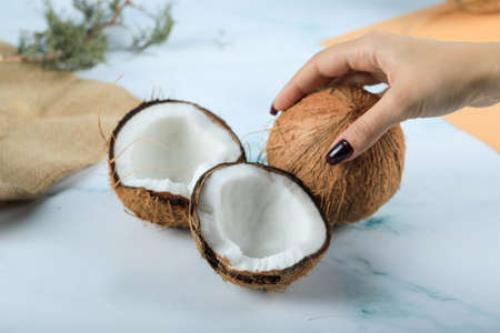 Cracked fresh coconut on white table background. Ripe half cut coconut. Coconut shell, cream and oil. Selective focus. Food ingredients, healthy lifestyle, paradise concept