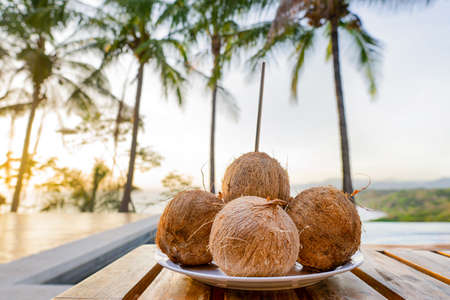 White plate with coconuts on a wooden table against a tropical background