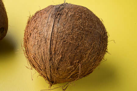 Whole ripe fresh Coconut set, on yellow textured summer background