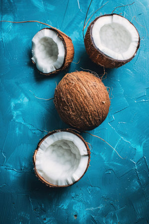 Whole and halved coconuts on an artistic blue background